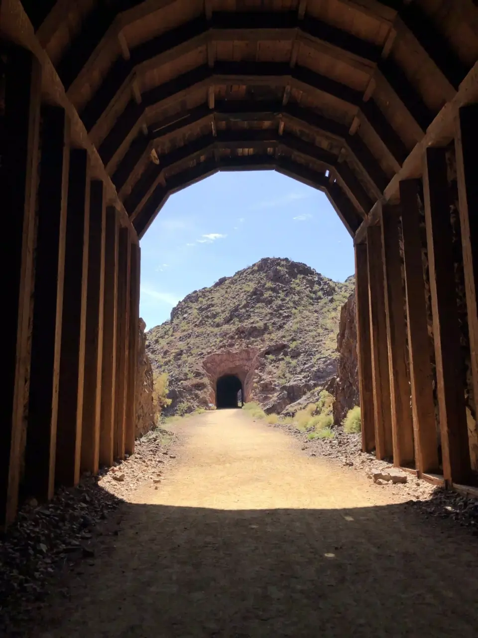Unser erstes Ziel heute heißt “Alan C. Bible Visitor Center”. Wir wollen keine Bibel-Stunde besuchen, obwohl das in den USA sicher sehr niederschwellig realisierbar wäre. Stattdessen planen wir den Historic Railroad Trail zu erkunden. Und dieser startet genau hier, an diesem Visitor Center. Dieser Trail ist ein 5 Meilen langer gut ausgebauter Wanderweg, oberhalb des Lake Mead. Er führt direkt am See entlang. Das Besondere sind nicht nur die grandiosen Ausblicke, sondern die Tatsache, dass man hier durch fünf ehemalige Eisenbahntunnel hindurch laufen kann, die eigens für den Bau des Hover Dam angelegt wurden. Leider ist der 3. Tunnel zur Zeit gesperrt, so dass man nach gut 2 km umkehren muss. Erwähnenswert ist vielleicht noch, dass man für diesen Teil des National Recreation Area keinen Park Pass benötigt, erst wenn man direkt zum See möchte, muss ein entsprechendes Gate passiert werden.