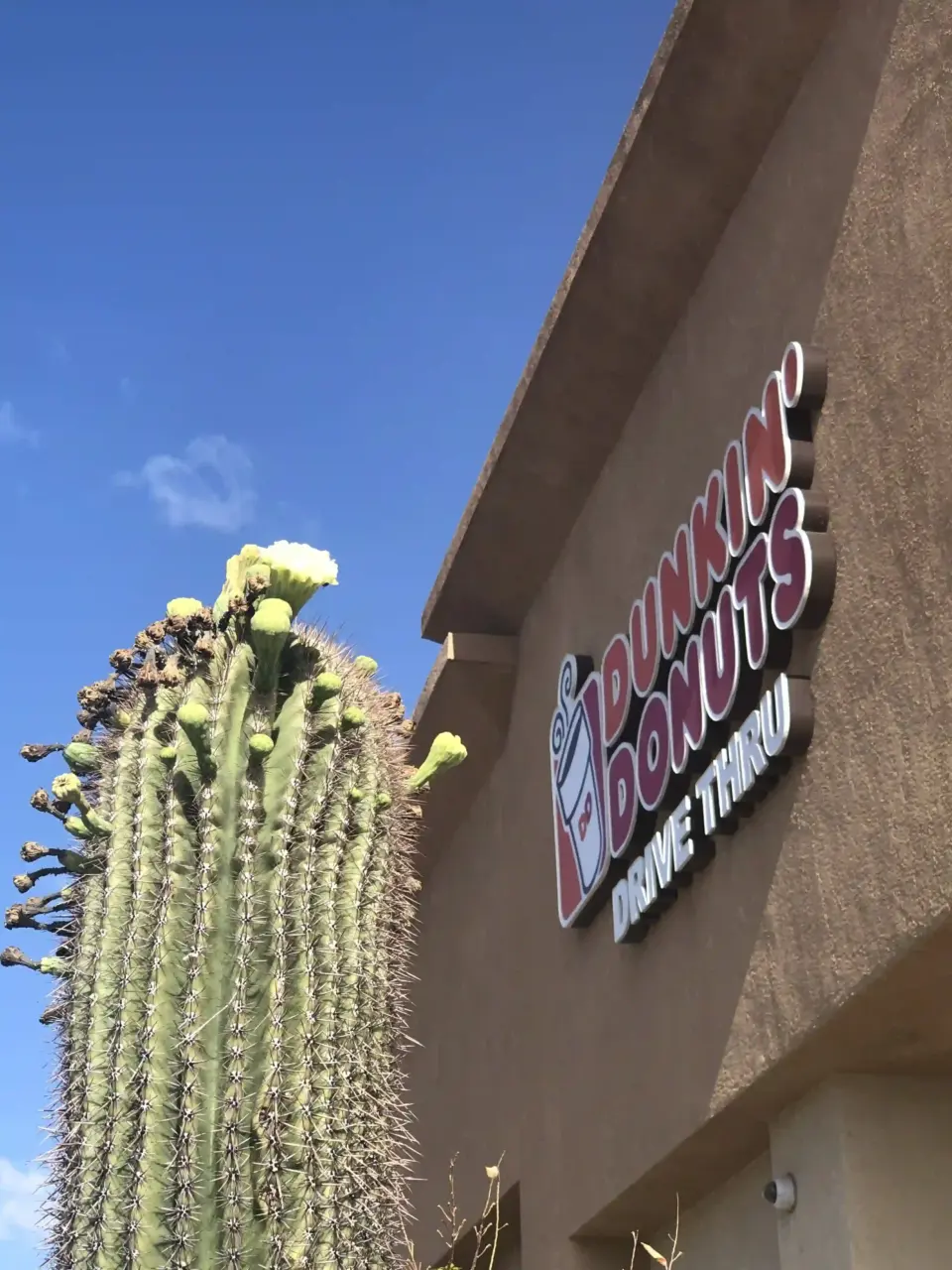 Nicht der Donut-Shop sollte das Motiv sein, es geht um den blühenden Saguaro!